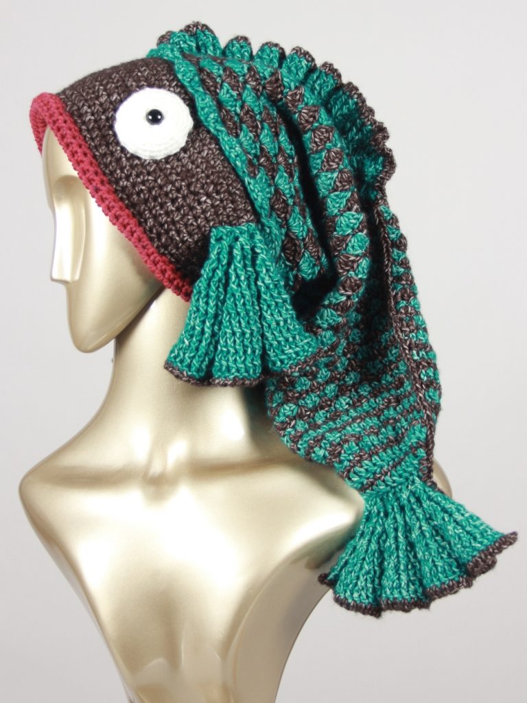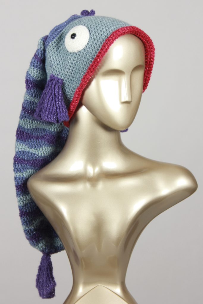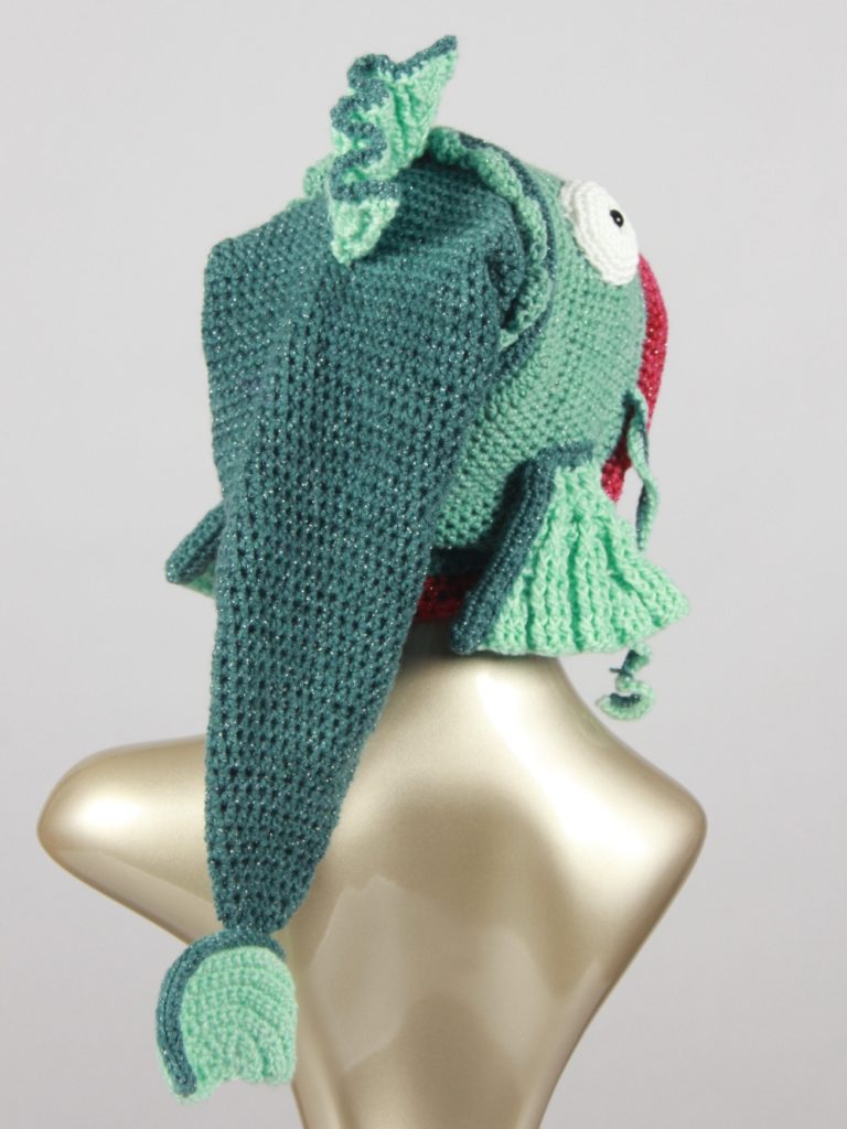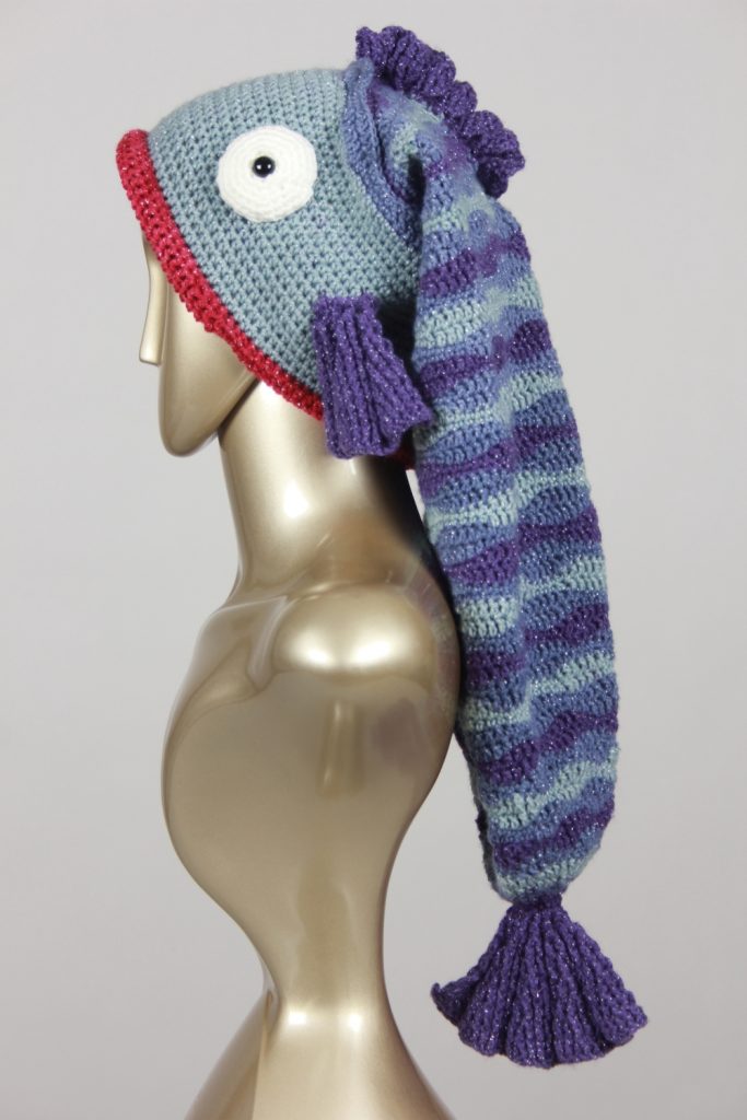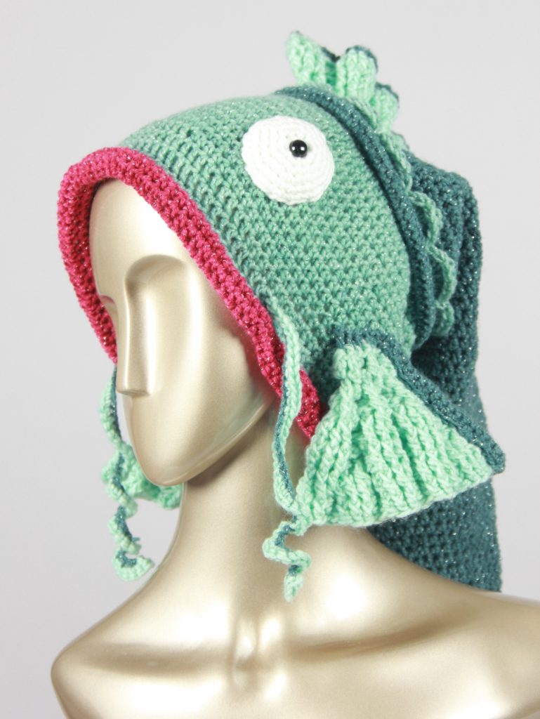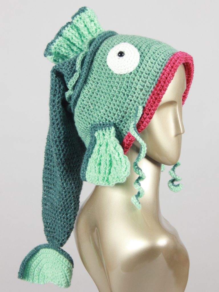 Mit diesem Fisch machst du einen guten Fang. Diese schöne, auffällige Fischmütze aus Glitzergarn (Polyacryl und Polyester) wird dich begeistern. Sie hat einen Umfang von ca. 55 cm und passt somit Erwachsenen. Mit einer Länge von über 60 cm ist dies die längste Fischmütze, die ich je gehäkelt habe.