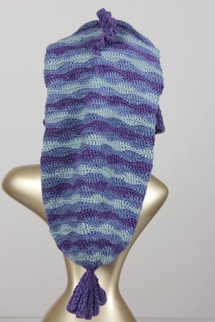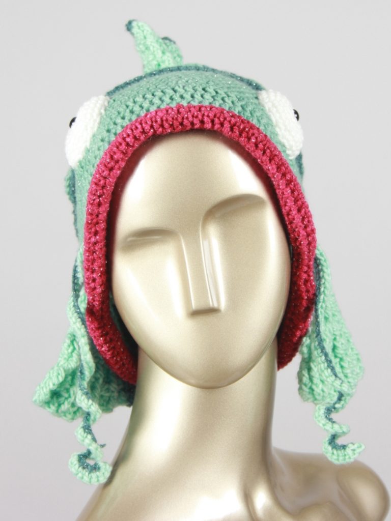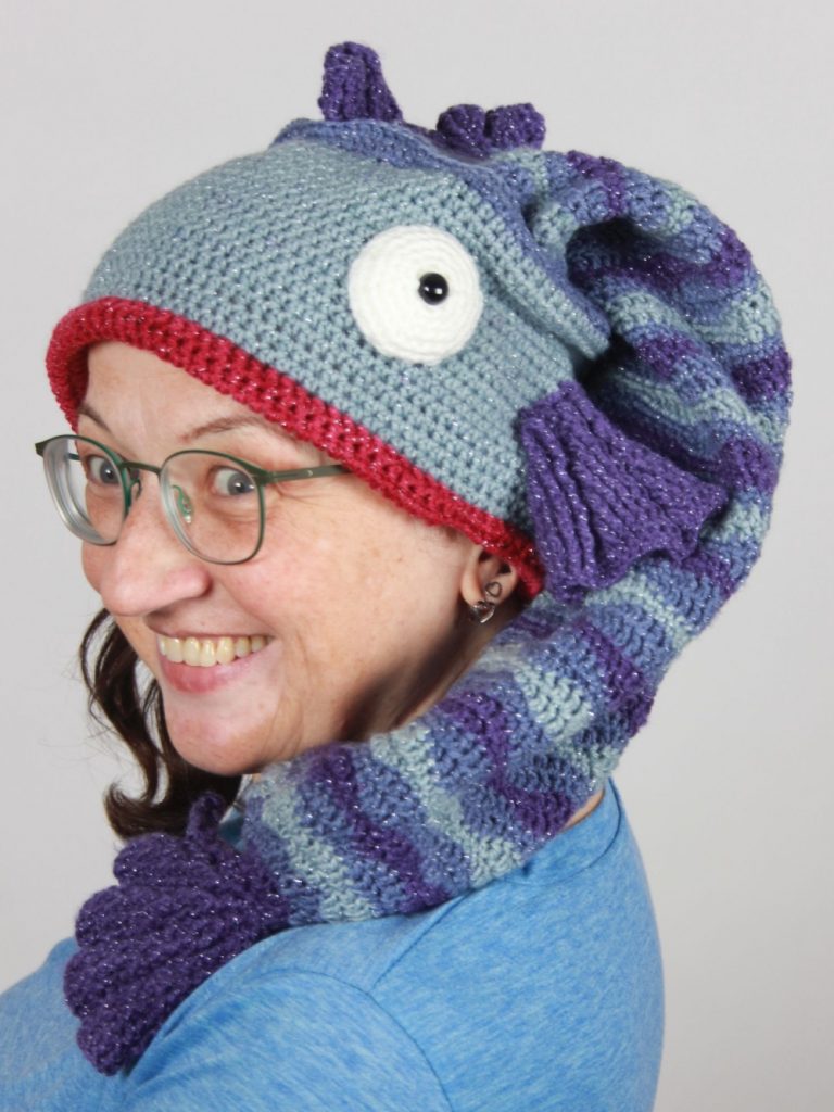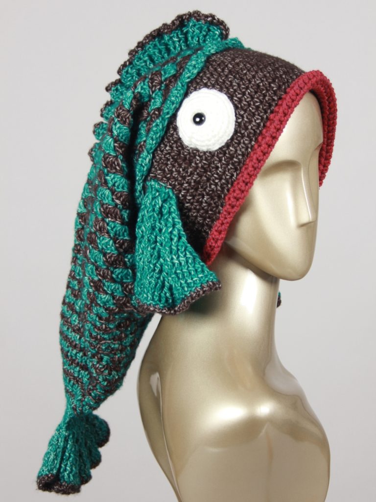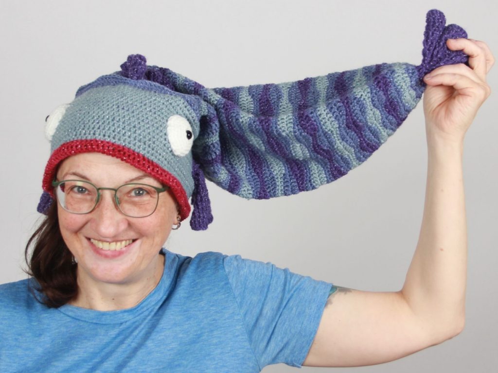 Mit diesem Fisch machst du einen guten Fang. Diese schöne, auffällige Fischmütze aus Glitzergarn (Polyacryl und Polyester) wird dich begeistern. Sie hat einen Umfang von ca. 55 cm und passt somit Erwachsenen. Mit einer Länge von über 60 cm ist dies die längste Fischmütze, die ich je gehäkelt habe.