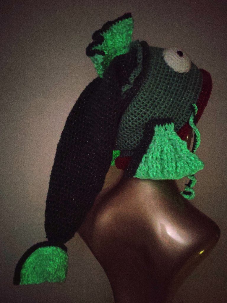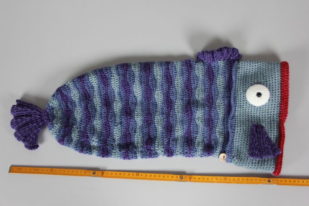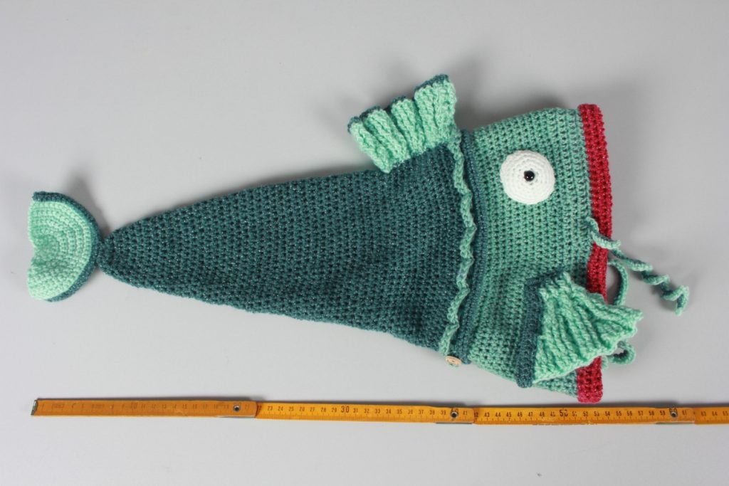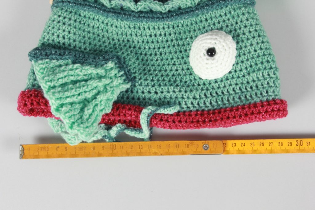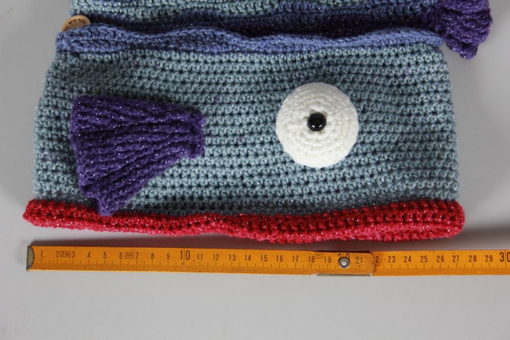 Diese schöne, auffällige Fischmütze aus Glitzergarn (Polyacryl und Polyester) wird dich begeistern. Mit ihrem Umfang von ca. 58 cm und 54 cm Länge ist diese Mütze etwas für größere Köpfe. In den Flossen wurde ein fluoreszierendes Garn mit eingearbeitet. – ACHTUNG: der Glow-in-the-dark-Effekt ist in Natura nicht so stark, wie auf dem Bild.