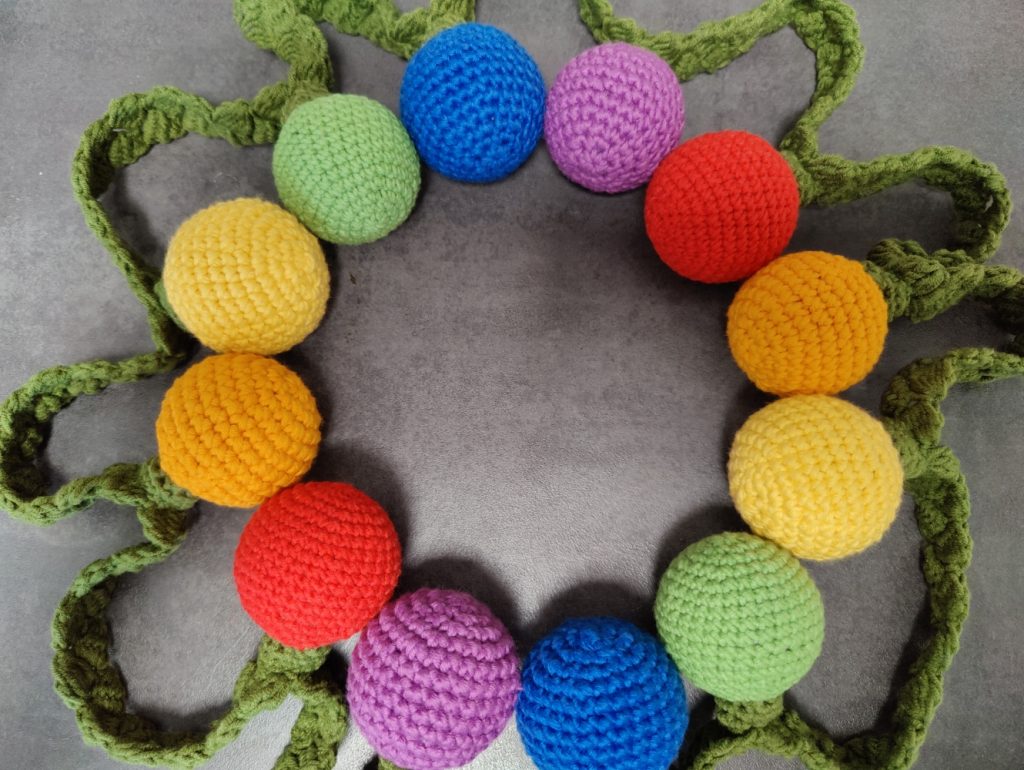 Die Anleitung habe ich auf Youtube bei naztazia entdeckt und für das Häkeln in Runden angepasst. Die Anleitung ist für ein Erdbeermuster in Reihen.