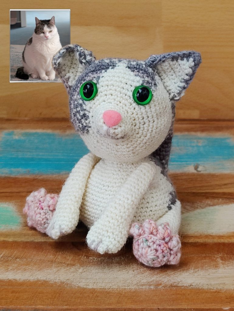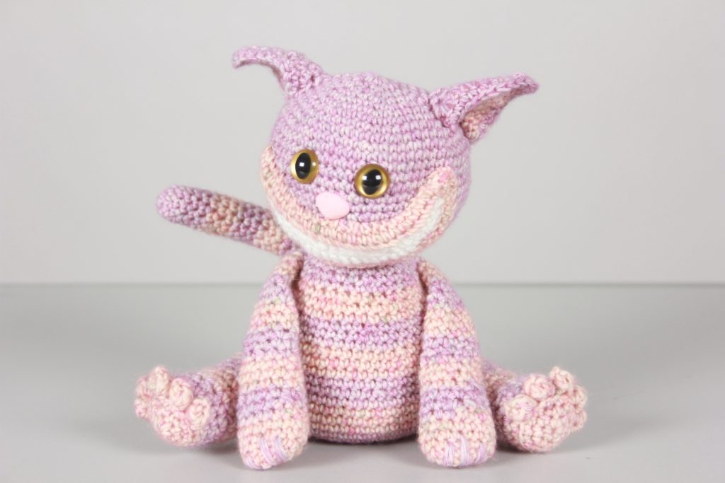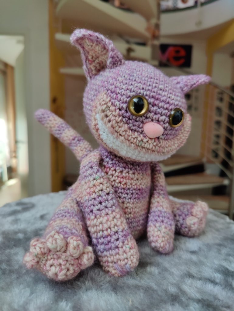 Dies ist meine gehäkelte Interpretation einer Grinsekatze. Im ersten Moment etwas gruselig, aber je länger man darauf schaut, desto niedlicher wird sie